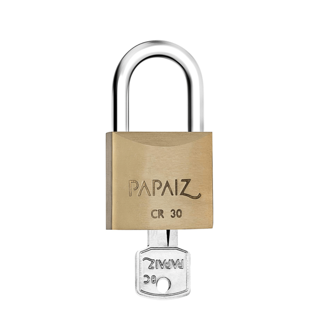 O Cadeado Papaiz CR30 Flowpack (0100300CX, código de barras 7891194000333) é um modelo de 30 mm em latão maciço, com haste de aço cementada e cromada, ideal para uso em portões, janelas, armários, registros de luz e caixas de correio. Ele vem embalado em flowpack e acompanha 2 chaves niqueladas, oferecendo alta durabilidade e segurança.