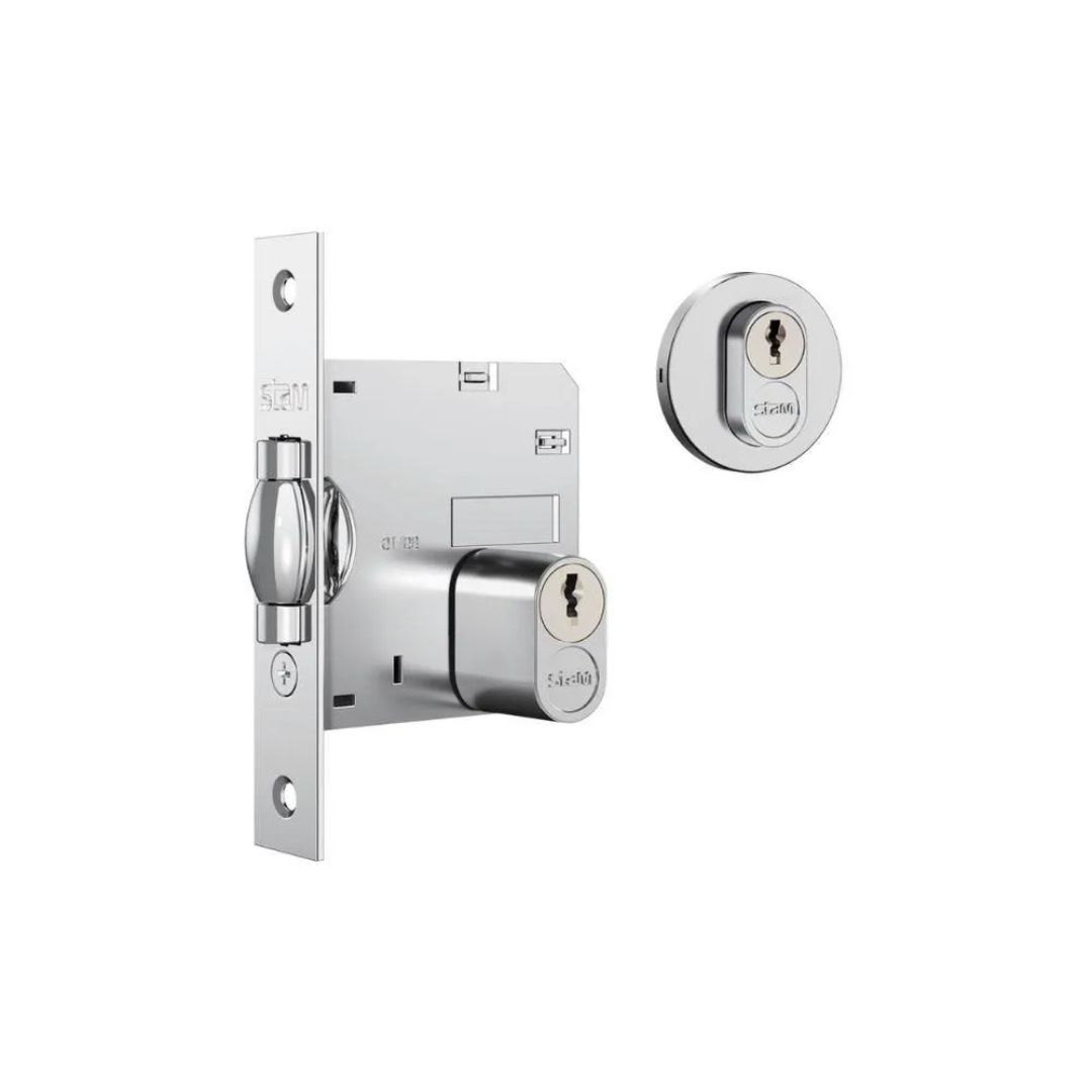 A Fechadura Stam 1005 Trinco Rolete com roseta redonda é ideal para portas pivotantes externas. Seu sistema de trinco rolete permite que a porta seja empurrada ou puxada com suavidade, sem necessidade de maçaneta — perfeita para portas com puxadores. O acabamento cromado confere um visual elegante e moderno, combinando com diversos estilos arquitetônicos.