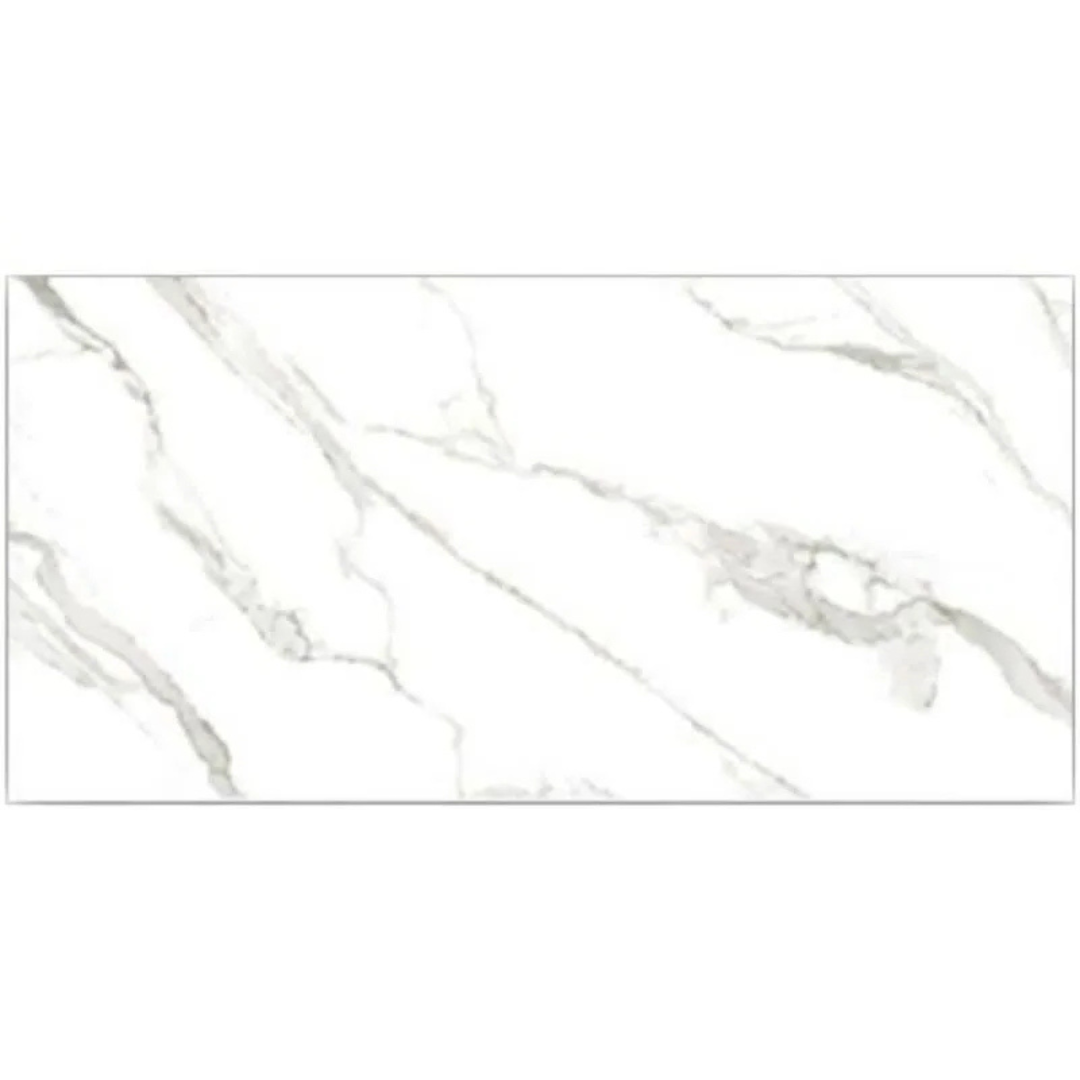 Seu design apresenta veios marcantes sobre fundo claro, reproduzindo com fidelidade a estética do mármore Statuario. O formato 60x120 cm reduz a quantidade de rejuntes, proporcionando um visual mais uniforme, contínuo e refinado.